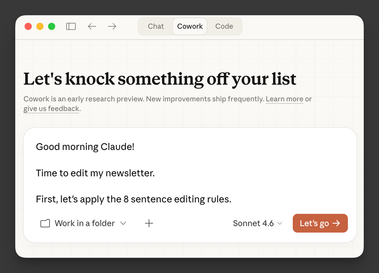 And anytime I want Claude to edit a draft using these principles, I just open Claude, paste in my text, and it knows exactly how I want my sentences tightened.