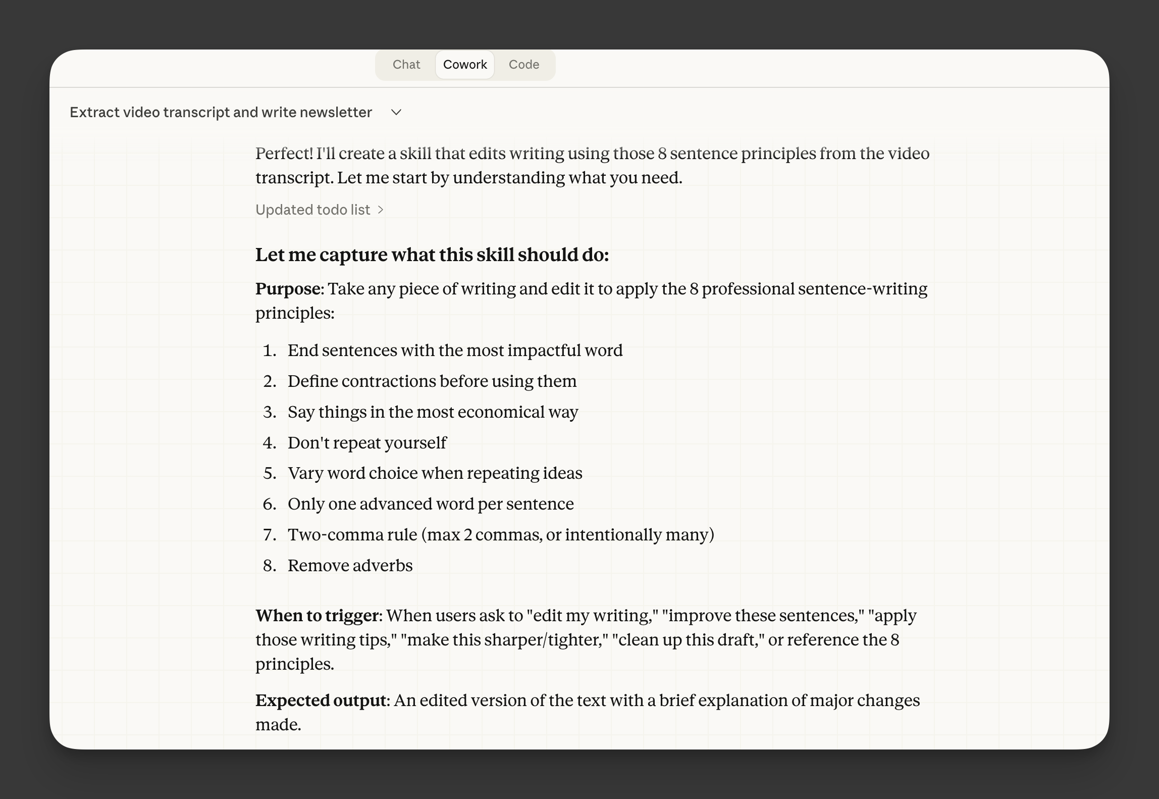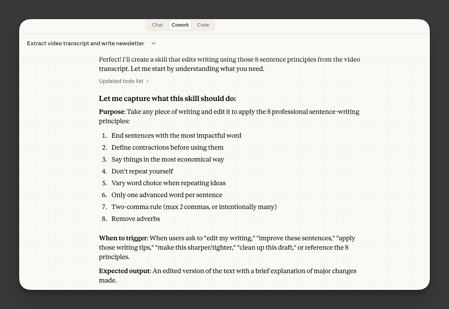 I fed my YouTube transcript to Claude Cowork and said: “Turn this into a .skill I can use to edit my writing.”